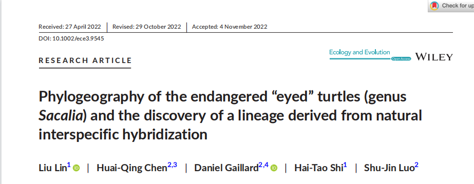生命科学学院林柳副教授为第一作者,史海涛教授为通讯作者的学术论文位居《生态和进化》期刊中国作者2022年第四季度发表文章三月内下载量前五,荣获“Wiley威立中国开放科学高贡献作者”荣誉。Wiley是指1807年创立于美国的出版商,是科研和教育出版领域的全球领导者。