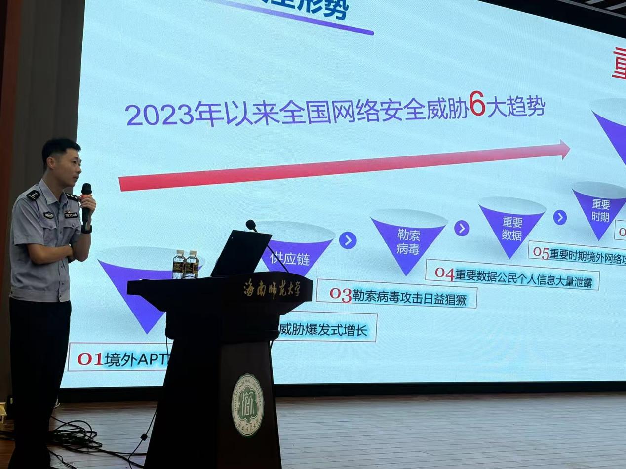 4月24日下午,海南师范大学桂林洋校区图书馆一楼学术报告厅,来自三亚市公安局网络警察支队警务技术一级主管王康亮警官,面向我校网络空间安全专业本科生、硕士研究生及相关专业教师开展讲座活动,报告题目《当前安全威胁形势下的网络安全探讨—网络安全进高校讲座》,讲座活动由网络空间安全一级学科硕士点负责人张鲲教授主持,本次讲座活动还邀请到了校企合作企业海南神州希望网络有限公司行业总监杨梦娇同志,参与了学术交流互动。
